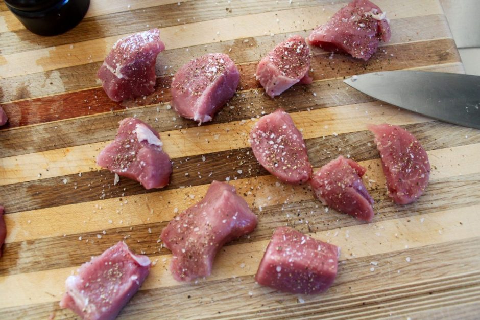 Season pork pieces with salt and pepper just before browning.